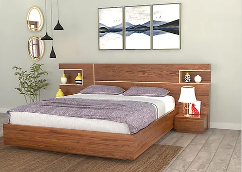 A double size bed with two hydraulic storages, bedside tables. A simple and sleek design for an elegant bedroom design.